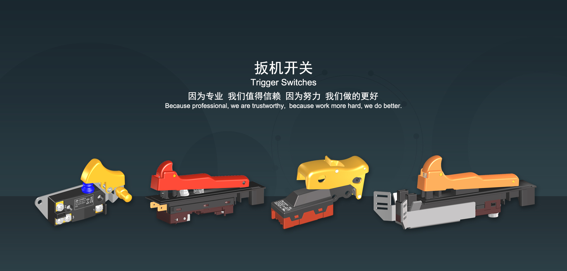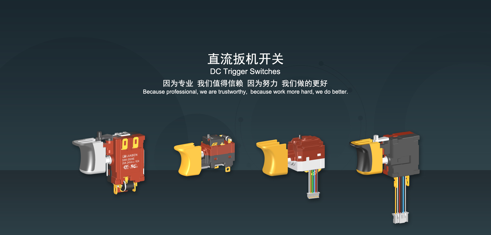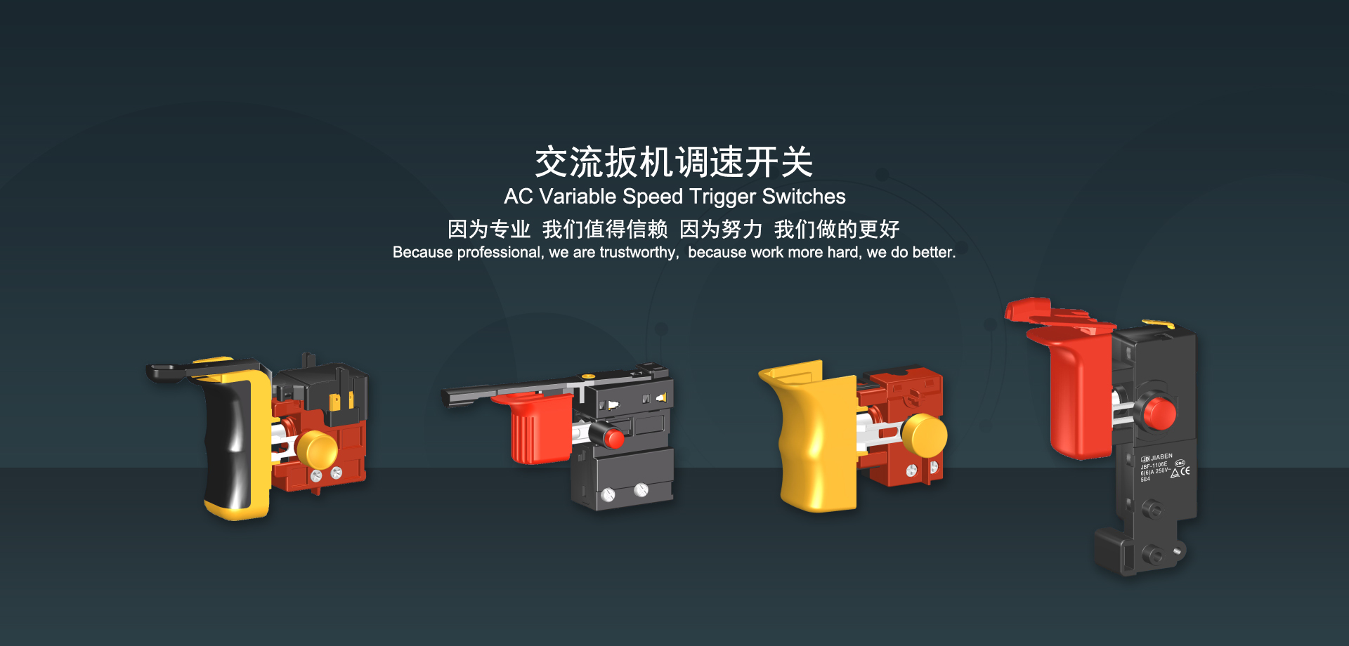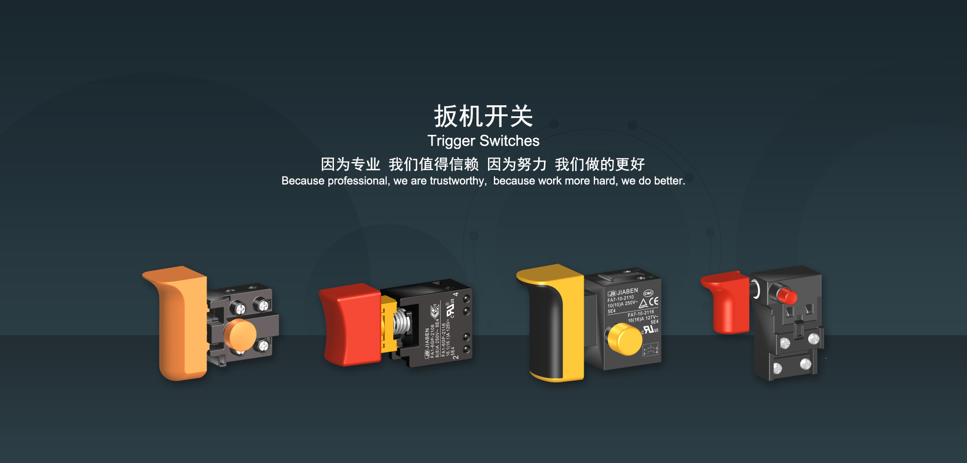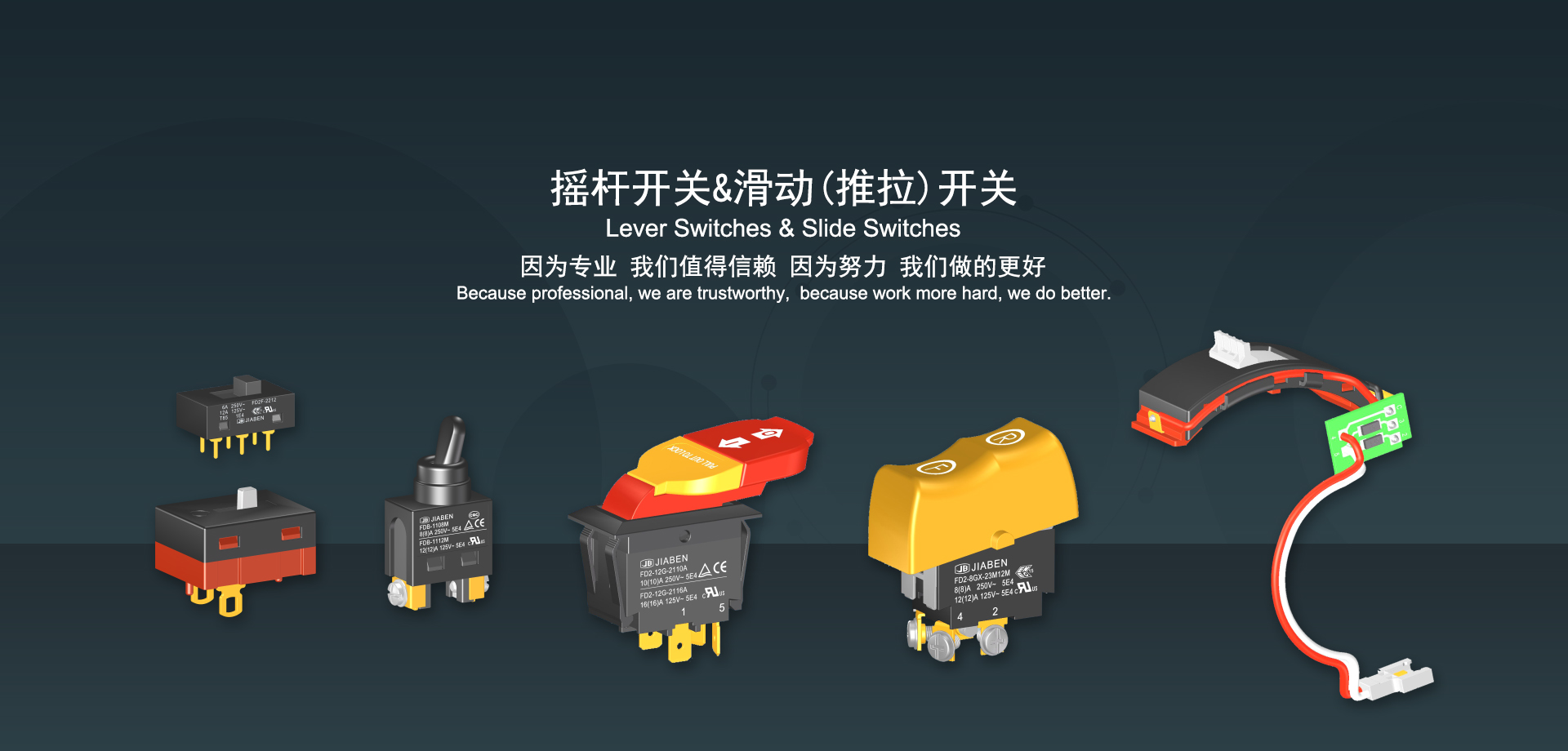 浙江佳奔電子有限公司始建于1986年,坐落于浙江省樂清市虹橋鎮(zhèn)東電子信息產(chǎn)業(yè)園內(nèi),現(xiàn)有職工700多人,資產(chǎn)總額超3億元。公司主要經(jīng)營“JIABEN”牌微動開關(guān)、蹺板開關(guān)、按鈕開關(guān)、扳機開關(guān)、調(diào)速開關(guān)和電位器開關(guān)等各類交、直流器具開關(guān)和各類交、直流線路板模塊等產(chǎn)品,主要應用于交、直流電動工具、電動園林工具、清潔器具、家用電器和小型機床等行業(yè),是集產(chǎn)品設(shè)計、研發(fā)、制造、銷售和服務于一體的國家高新技術(shù)企業(yè)。JIABEN was founded in 1986, located in East Electronic Information Industry Park, Hongqiao Town, Yueqing City, Zhejiang Proviance, existing staff more than 700 peoples, more than 300 million RMB worth of assets. Company is mainly engaged in "JIABEN" brand Micro Switch, Rocker Switch, Push-button Switch, Trigger Switch, Speed Regulating Switch, Potentiometer Switch and other kinds of appliance switch and all kinds of AC or DC circuit board module, such as more than 100 series, 8000 kinds of models of products, mainly used in AC or DC Power-tools, Power Gardening Tools, Cleaning Appliances, Household Appliances and Small Machine Tool and other industries, is the collection product design, research and development, manufacturing, sales and service in one of the national high and new technology enterprise.